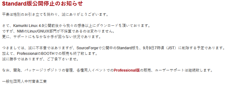 Vielen Dank für Ihre weitere Unterstützung. Es wurden mehr Downloads durchgeführt als wir zur Veröffentlichung von Kamuriki Linux 4.0 erwartet hatten. Die Linux/GNU/X-Sparte von Nakamura Music Industry Co., Ltd. (NMI) ist jedoch immer noch unrentabel. Darüber hinaus ist es schwierig, viel Unterstützung zu bekommen. Wir planen deswegen, die Version aus dem Download-Portal zu entfernen.
