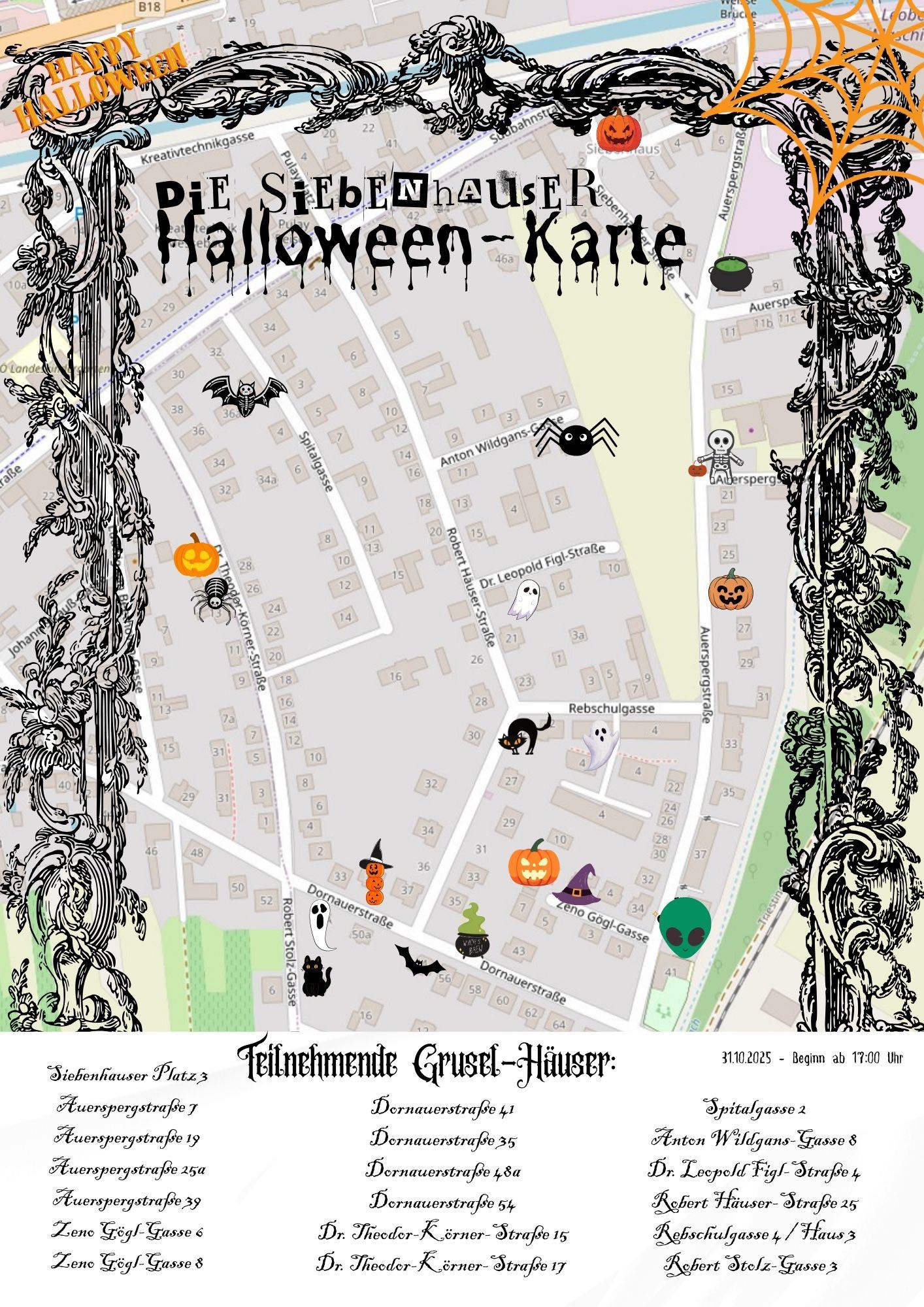 Aufgrund einer Initiative von Siebenhauser Bewohnern wurde heuer erstmals eine "Siebenhauser Halloween Karte" ins Leben gerufen. Alle Bewohner aus Schönau-Siebenhaus waren aufgerufen bei dem Fest am 31. Oktober mitzumachen, Ihre Häuser schön gruselig zu schmücken - und genug "Süßes sonst gibt's Saures" daheim zu haben.