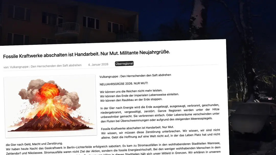 "Die Angebote an Teilhabe einer verbrannten Welt weisen wir mit unserer militanten Aktion zurück", heißt es in dem Schreiben. "Deshalb haben wir die Aktion auf das Gaskraftwerk in Lichterfelde gemacht. Wir verhindern dadurch nicht unsere eigene Verstrickung in eine imperiale Lebensweise auf Kosten anderen Lebens, aber wir setzen ein Signal. Einmal mehr, so wie das viele Menschen und Gruppen an unterschiedlichen Orten der Welt tun. Wie das auch hier einige Gruppen, wie beispielsweise Vulkangruppen seit 2011 beständig tun."